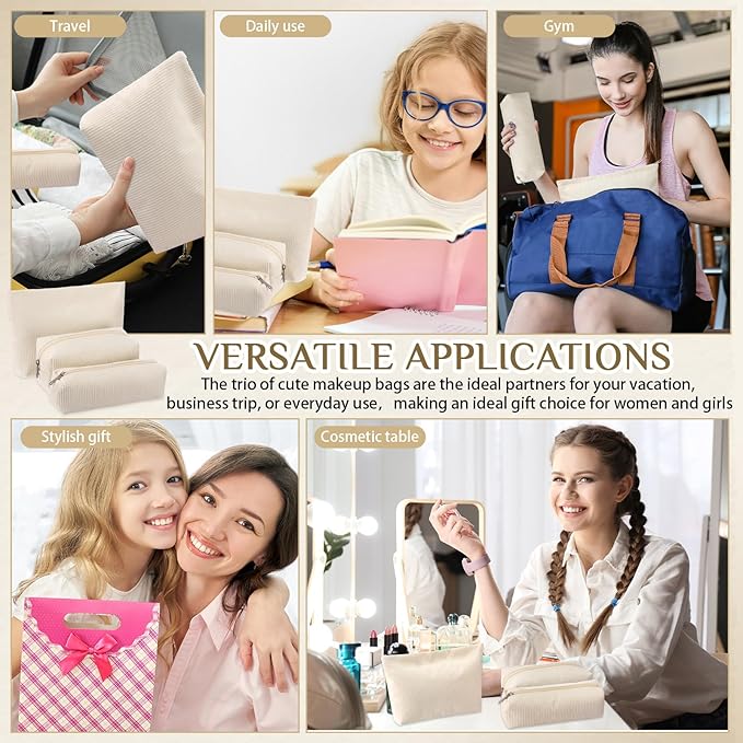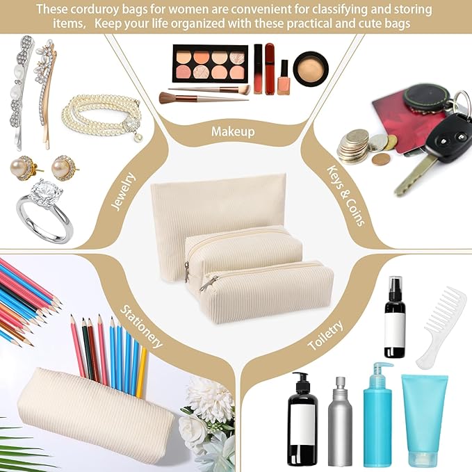 - Material and Attractive Design: the makeup and toiletry bag set is mainly crafted from quality corduroy material, ensuring high durability and prolonged service life; The bags feature an adorable and delicate design with classic style in different sizes on the white color surface; This makes them compatible with various styles of outfits