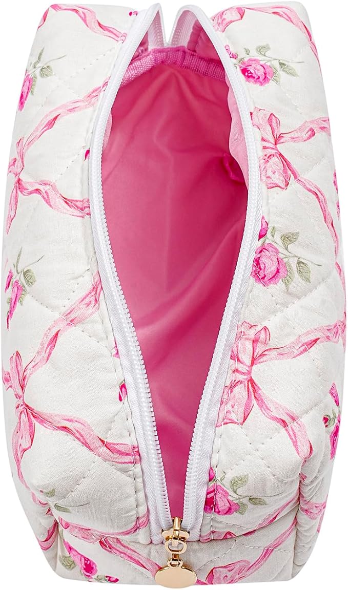 Gleyemor Small Quilted Makeup Bag for Women, Cute Floral Bow Cosmetic Bag, Emergency Bag Travel Toiletry Cotton Pouch Gifts for Girls Her Mom Friend Sister Bridesmaid (Pink Bowknot&Rose)