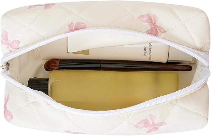 Gleyemor Small Quilted Makeup Bag for Women, Cute Floral Bow Cosmetic Bag, Emergency Bag Travel Toiletry Cotton Pouch Gifts for Girls Her Mom Friend Sister Bridesmaid (Small Pink Bowknot)
