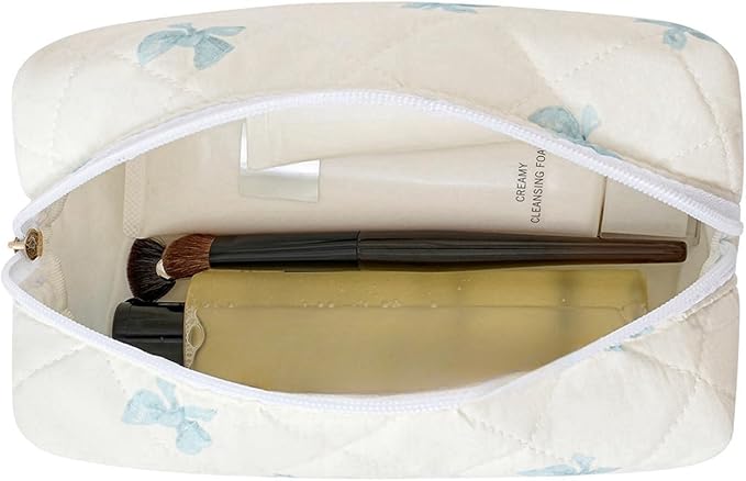 Gleyemor Small Quilted Makeup Bag for Women, Cute Floral Bow Cosmetic Bag, Emergency Bag Travel Toiletry Cotton Pouch Gifts for Girls Her Mom Friend Sister Bridesmaid (Small Blue Bowknot)