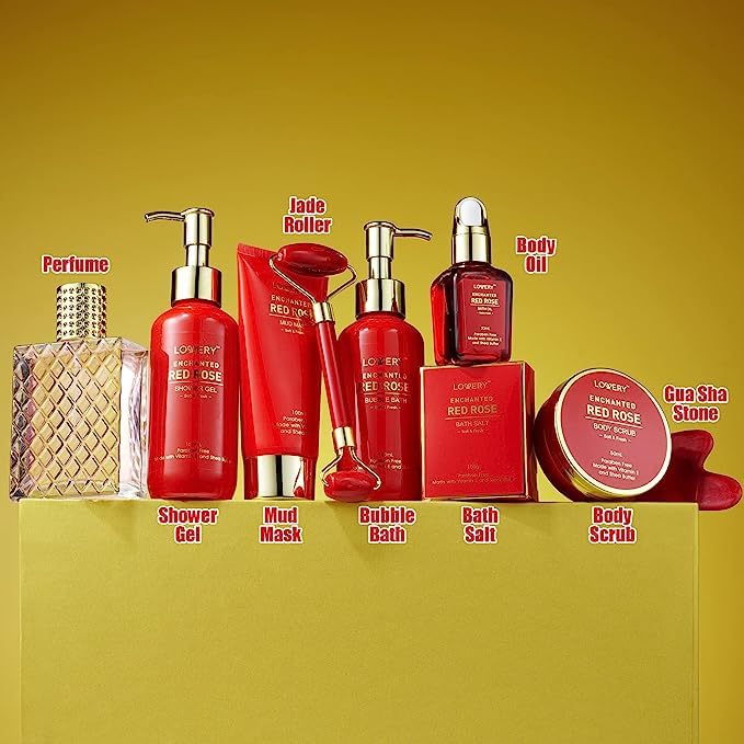 - 11 PIECE BEAUTY & PERSONAL CARE - Each Gift Basket contains premium Bath and Shower Essentials: Shower Gel, Bubble Bath, Full Size Eau de Parfum, Bath Salts, Body Scrub, Massage Body Oil, Mud Mask, 100% Quartz Gua Sha Stone, Quartz Jade Roller, wrapped in a Handmade Red Tub. It also has a gift note card for you to personalize it.