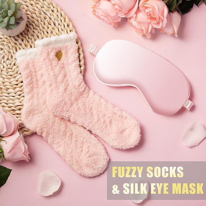 - Keeps you Warm All Seasons: A thick fleece blanket (40"W x 60" L) features premium skin-friendly plush flannel that is super cozy and fluffy. Wrap your lady in warmth and comfort with this throw blanket while providing a sense of security, while the furry socks keep her feet cozy and warm. The silk eye mask masks naturally relieve your tension and improve your mood through a peaceful full night's sleep, while keeping your eyes relaxed
