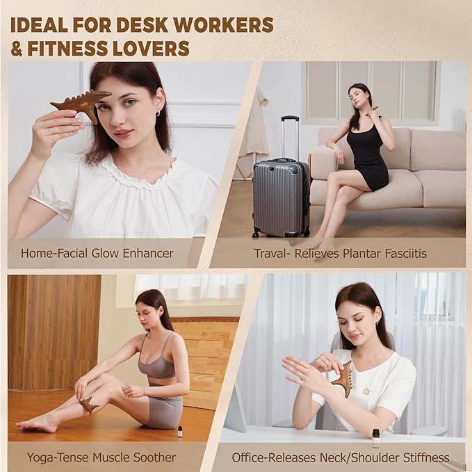 - π πππ ππππ ππππππππ ππππππ: The fishtail-style scraper glides smoothly over the limbs, neck, and back. The rounded base provides a gentle wood therapy massage that helps release tightness and promote overall comfort.