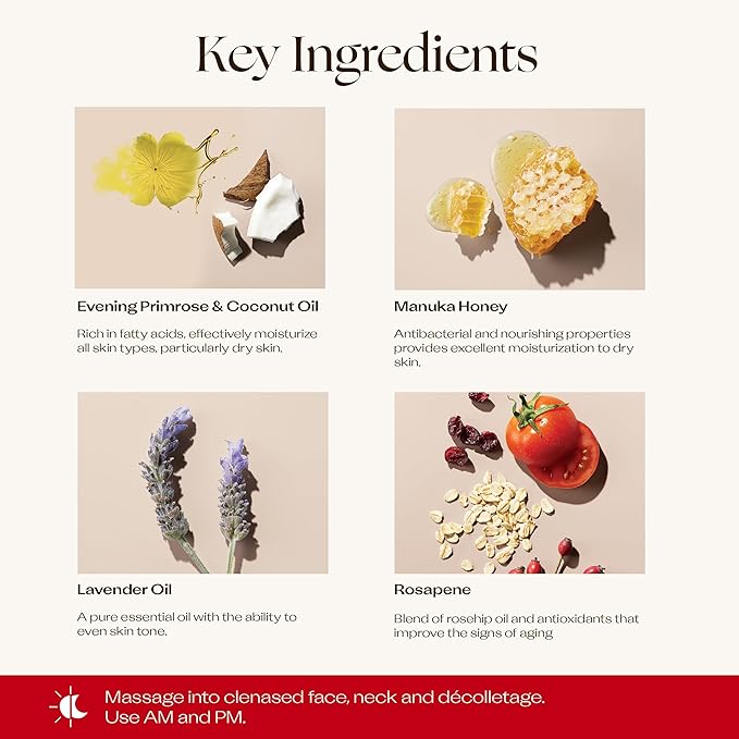 - Evening Primrose and Coconut Oils: Paired with New Zealand manuka honey, essential oils soothe and protect for a soft, even complexion.