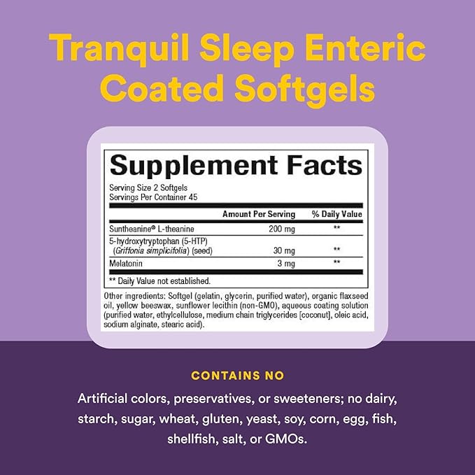 - A natural sleep aid: Contains Suntheanine L-Theanine (200 mg), 5-HTP (30 mg) and melatonin (3 mg) to support every stage of slumber