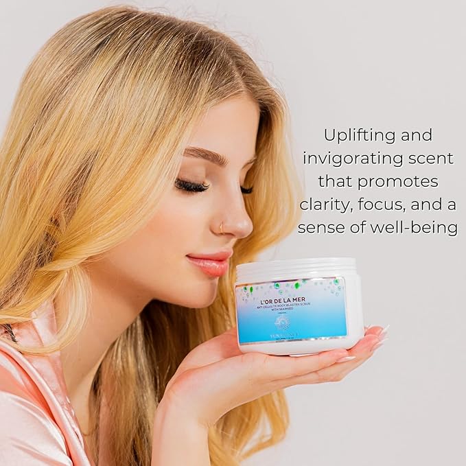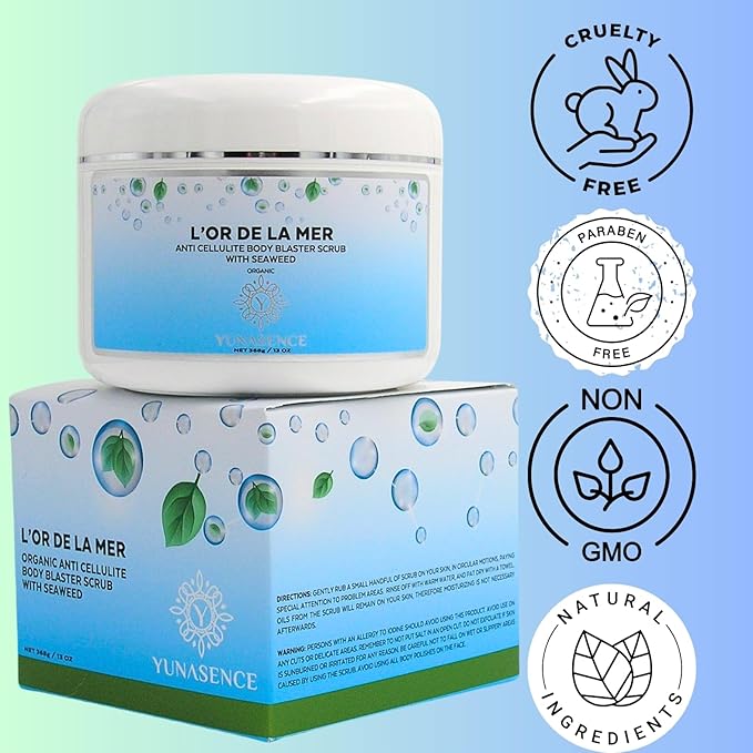 YUNASENCE L'OR DE LA MER Organic Anti Cellulite Body Blaster Scrub with Sea Salt, Seaweed, Lemongrass 13oz Smoothing Exfoliating Moisturizing Skin Massage Treatment.