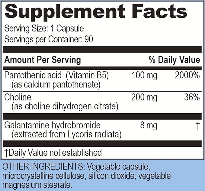 - đđ¨đđđ§đ đđ§đ đŤđđđ˘đđ§đđŹ: This brain supplement formula contains a combination of brain health nutrients, including Pantothenic acid (Vitamin B5, as calcium pantothenate), Choline (as choline dihydrogen citrate), and Galantamine hydrobromide (extracted from Galanthus nivalis). Other Ingredients of this nootropic mind supplement include a gelatin capsule, rice flour, silicon dioxide, and magnesium stearate.