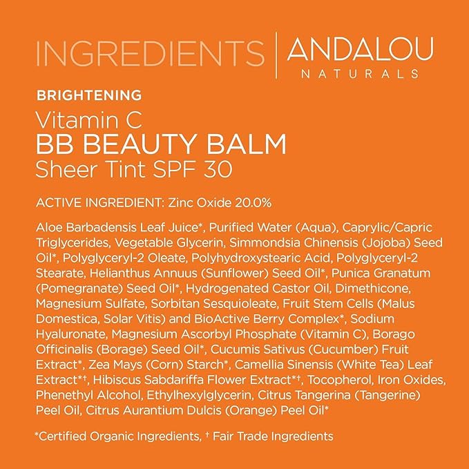 Andalou Naturals Vitamin C BB Beauty Balm Sheer Tint SPF 30, 2-in-1 BB Cream & Face Sunscreen with Broad Spectrum Protection, Mineral Sunscreen with Non-Nano Zinc Oxide, 2 Fl Oz