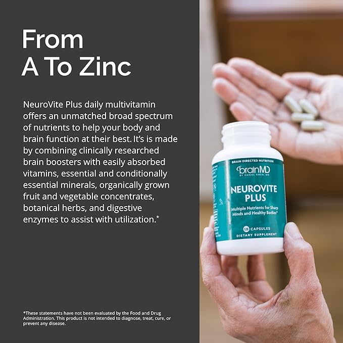 Dr Amen BrainMD NeuroVite Plus - 120 Capsules - Multivitamin & Mineral Supplement, Enhanced with Phytonutrients, Enzymes & Whole Foods - Gluten Free - 30 Servings