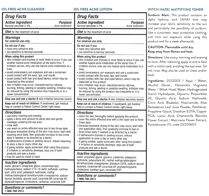 • Acne Treatment Kit: For mild to severe acne, blackheads and whiteheads, this set eliminates breakouts with Benzoyl Peroxide for visibly clearer skin; Includes our Oil Free Acne Cleanser, Witch Hazel Mattifying Toner and Oil Free Acne Lotion