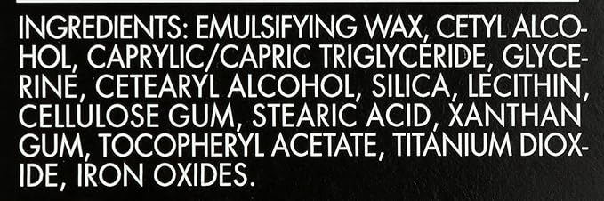 - Naturally Sourced Ingredients: Emulsifying Wax, Cetyl Alcohol, Caprylic/Capric Triglyceride, Glycerin, Cetearyl Alcohol, Silica, Lecithin, Cellulose Gum, Stearic Acid, Xanthan Gum, Tocopheryl Acetate, Titanium Dioxide, Iron Oxides.