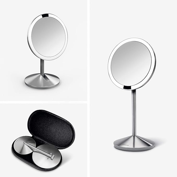 simplehuman Sensor Mirror, 5" Round Rechargeable Mini Travel Makeup Mirror, 10x Magnification, Brushed Stainless Steel