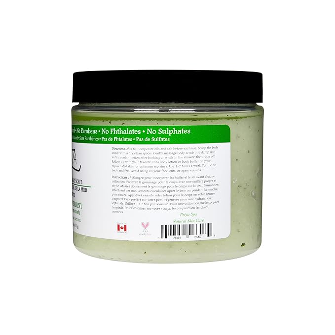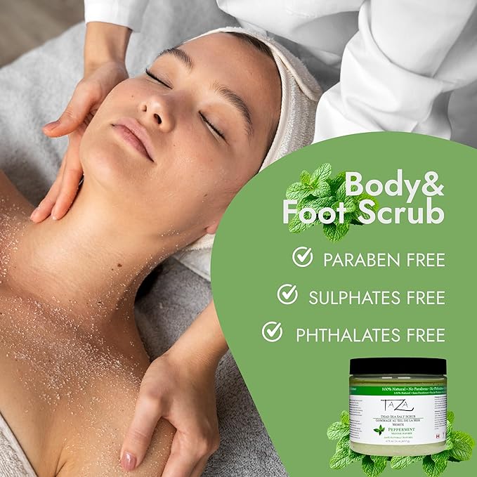 - Taza Dead Sea Salt Scrub contains a blend of cleansing salts and highly moisturizing oils to exfoliate and soften the skin