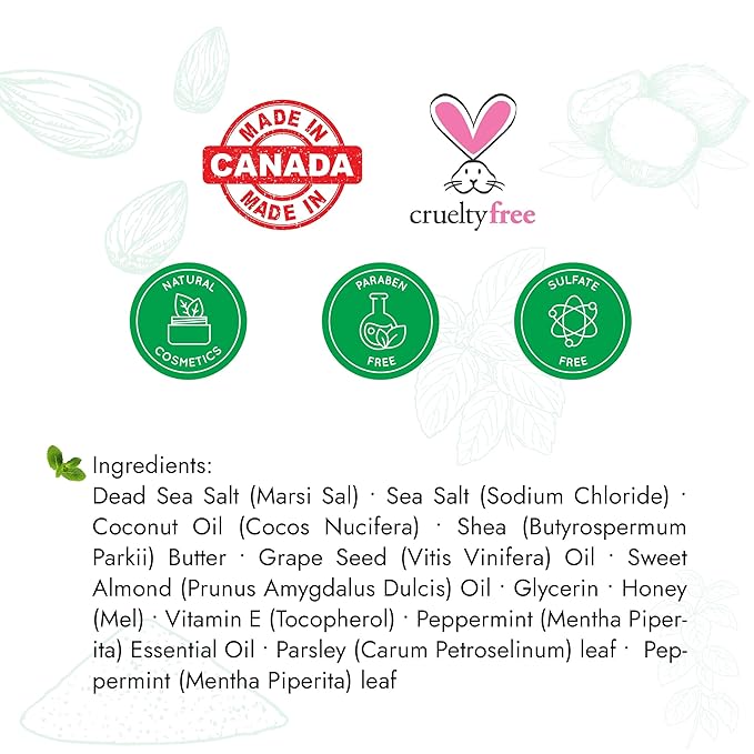 - Contains Dead Sea Salt, Shea Butter, Coconut Oil, and Honey which: makes you skin look visibly younger, radiant, refreshed, energised, and rejuvenated; diminishes and reduces the look, or the signs of aging; makes wrinkles appear reduced