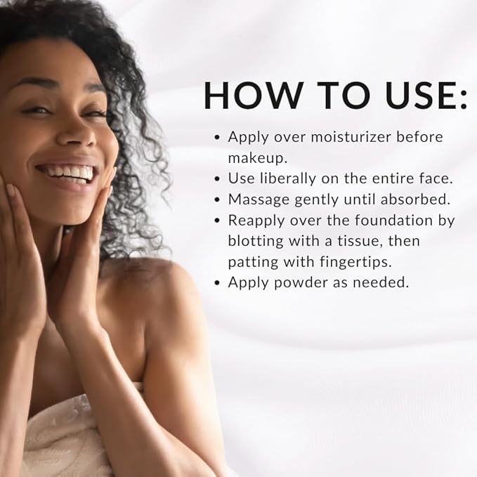- PRO TIP: Apply over moisturizer before makeup; apply liberally over entire face and massage gently until absorbed; can be re-applied over foundation, first blot with a tissue and then pat with a rolling motion with your fingertips; after, apply powder as needed