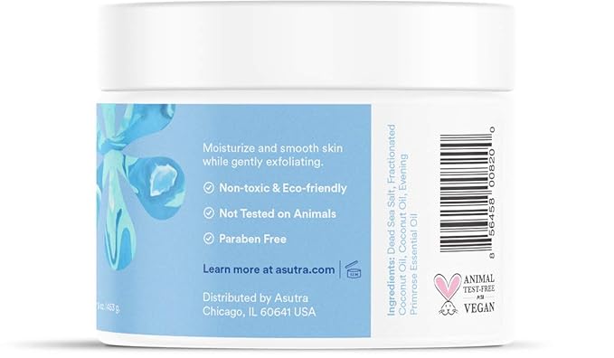 • EXFOLIATES GENTLY: The Asutra Exfoliating Body Scrub contains over 20 healing minerals found in sea salt that make it an excellent natural exfoliator and skin polisher. This 100% pure Dead Sea salt is ground fine for gentle exfoliation.