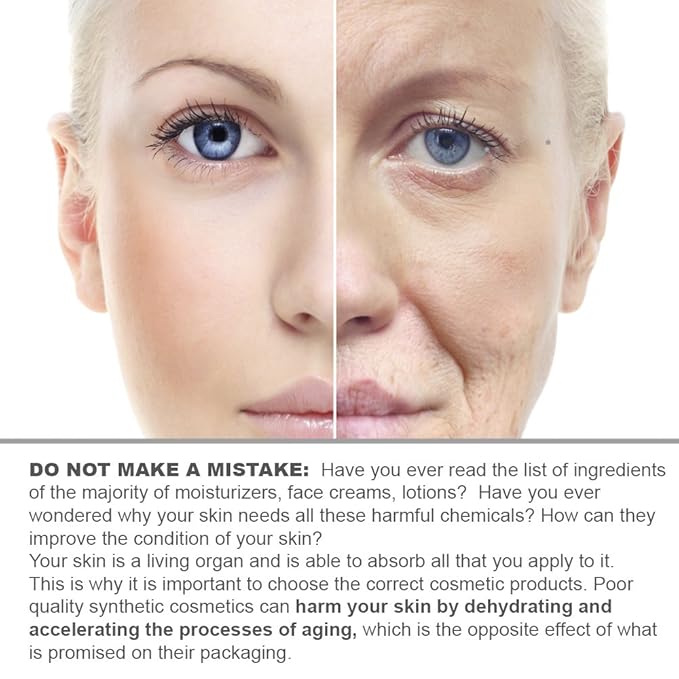 • DO NOT MAKE A MISTAKE: Your skin is able to absorb all that you apply to it. This is why it is very important to choose the correct and safe cosmetic products. Poor quality synthetic cosmetics can harm your skin, dehydrate, accelerate processes of aging. When we were developing our Organic Moisturizer formula - we were thinking about the health of your skin as our first priority.
