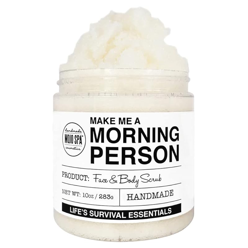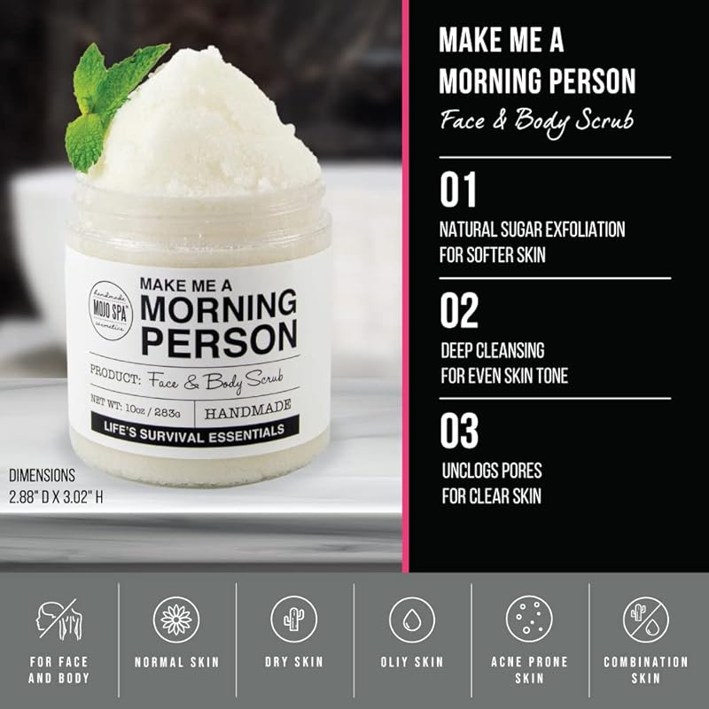 Mojo Spa Make Me a Morning Person Face and Body Scrub for Women and Men, Deep Moisturizing Facial and Full Exfoliating Skincare with Peppermint and Rosemary Scent, Sugar Based Exfoliator, 10 oz.