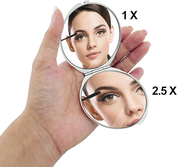 • Dual-Sided Mirror: Compact round make-up folding mirror featuring a standard mirror on one side and 2.5x magnification on the other for detailed makeup application on the go