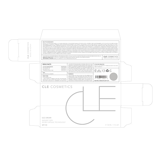 CLE Cosmetics CCC Cream (Neutral Medium Light 201 / SPF 50) - Color Correcting CC Cream with Sunscreen - Lightweight, Hydrating, Light to Medium Coverage Foundation - BB & CC Hybrid - 1 fl oz