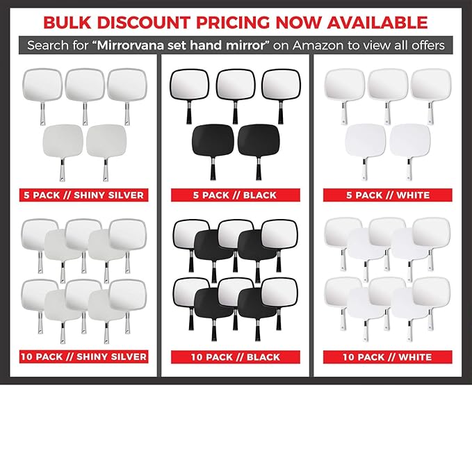 - This PACK / SET includes FIVE Mirrorvana Large & Comfy Hand Held Mirror with Handle (2018 Salon Model in White), Model # MVHH79W1X, for a GREAT VALUE. Save on average an extra $10 when you buy bulk hand mirrors like this pack/set of 5 versus buying just one.