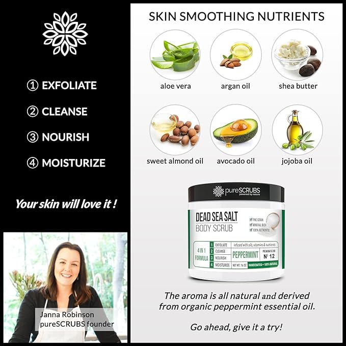 - GET ULTRA SMOOTH SKIN FAST - THIS WORKS! Our unique “4 in 1 Formula” does everything a body scrub should do and more - EXFOLIATE, CLEANSE, NOURISH & MOISTURIZE. Fine grain dead sea salt infused with essential oils, nutrients and skin softeners helps to smooth away rough, bumpy, and uneven textures to instantly reveal your true soft, healthy and radiant skin. You'll love the peppermint aroma!