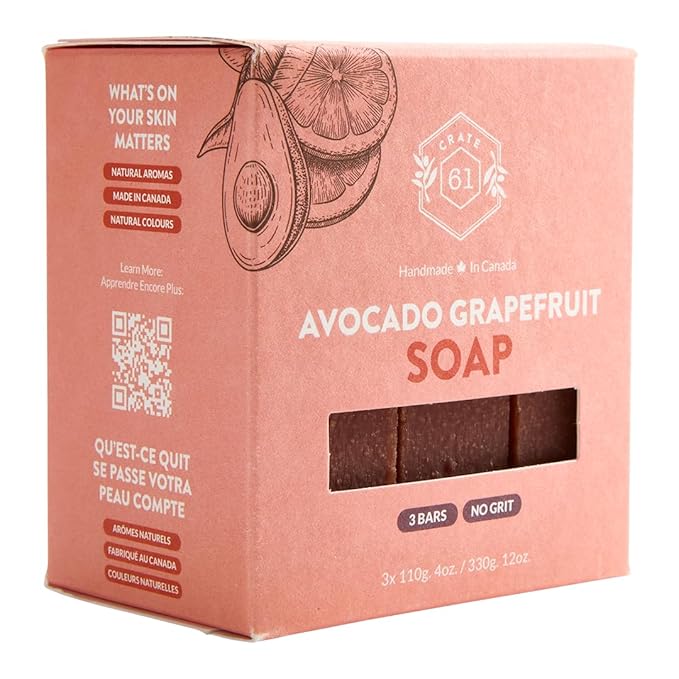 Handmade in Canada, Plant Based Cold Process Natural Bar Soap For Face And Body, With Premium Essential Oils, For Men And Women 3 Pack (Avocado Grapefruit)