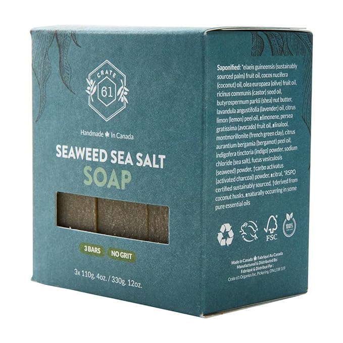 Handmade in Canada, Plant Based Cold Process Natural Bar Soap For Face & Body, With Premium Essential Oils, For Men And Women 3 Pack (Seaweed and Sea Salt)