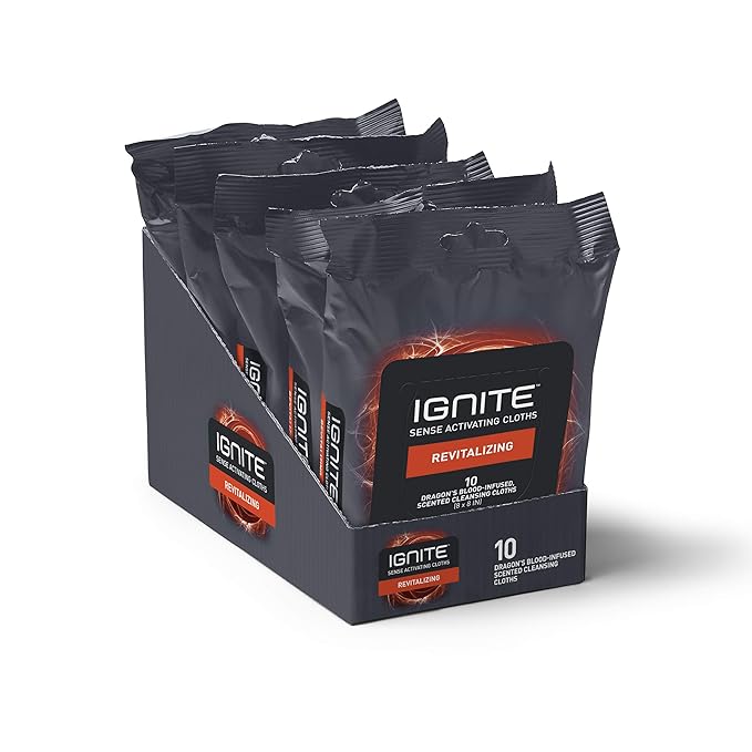 Ignite Mens Body Wet Wipes, Extra Thick 8" x 8" Shower Wipes, Revitalizing Scent, 10 Count (Pack of 5)