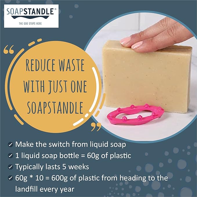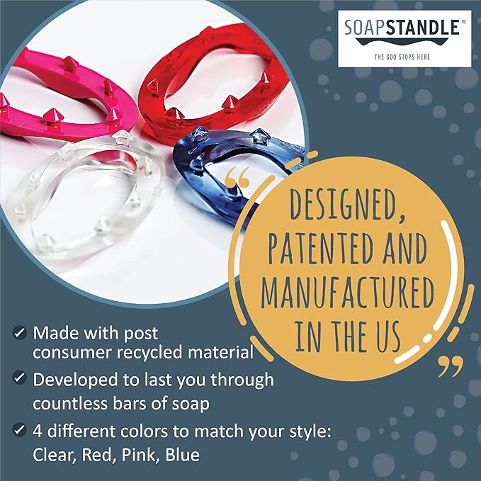 • AMERICAN EXCELLENCE FOR ENVIRONMENTAL IMPACT - Designed, patented, and manufactured in the USA, so you're supporting American workers with every purchase. You’re also helping the Earth because the SoapStandle is made from post-consumer plastic that will last you through countless bars of soap and keep plastic bottles of liquid soap out of the landfill. If a bottle with 60 grams of plastic lasts 5 weeks, that means every year 600 grams of plastic can be saved with just one SoapStandle.