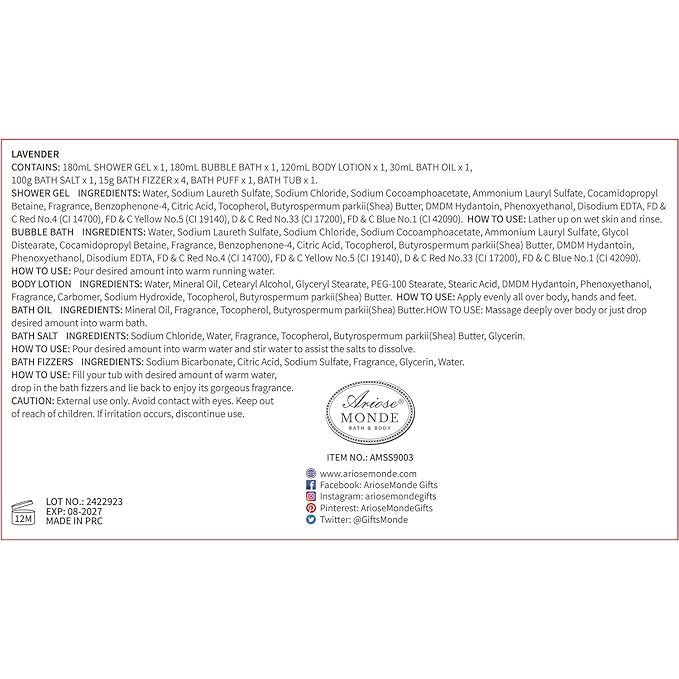 • LONG LASTING FRAGRANCE: Sweet and beloved lavender scent, using the principle of fragrance retention by essential oils, gently cleanses with a pampering lather to leave your skin moisturized long after the bath. Pamper yourself with this luxurious collection of spa products