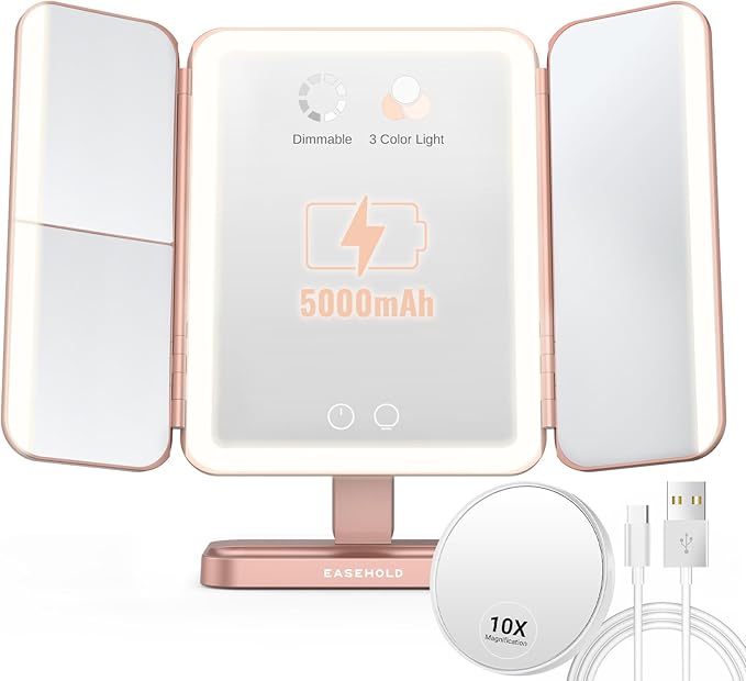EASEHOLD Rechargable Makeup Mirror Vanity Mirror with Lights, 5000Mah & USB Cable, 112 LEDs Lighted Trifold Mirror with 1X 2X 3X 10X Magnification, Smart Touch, Portable Cosmetic Beauty Mirror