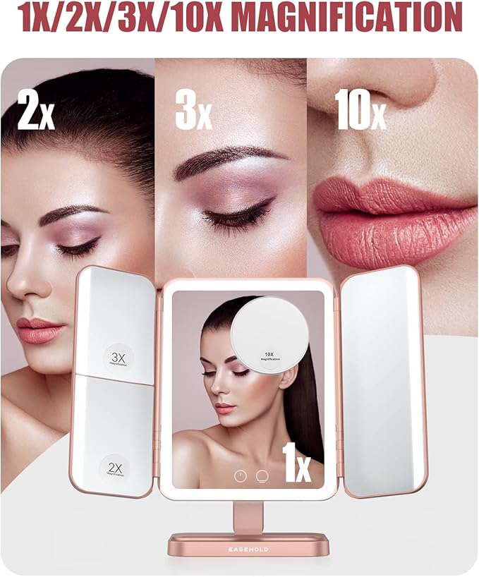 - 🌷【Convenient 1X/2X/3X/10X Options】This desk mirror with light provides the perfect balance between utility and style. With this tri-fold mirror, you can delve your whole delicate makeup with 1X, apply perfect eyeliner with 3X, outline a plump lip shape with 2X, or adjust detailed drawings on your face with an attachable 10X! Easehold makeup mirror with lighting is great for focusing on your beauty.