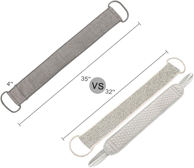 • Extra Long Size: Full coverage 35'' x 4'' size, longer and wider, grab the handle in both hands, and the loofah back exfoliating scrubber won't roll, fold, or twist during use as can happen with narrower back straps, making it convenient to reach your entire back and do a deep cleaning.