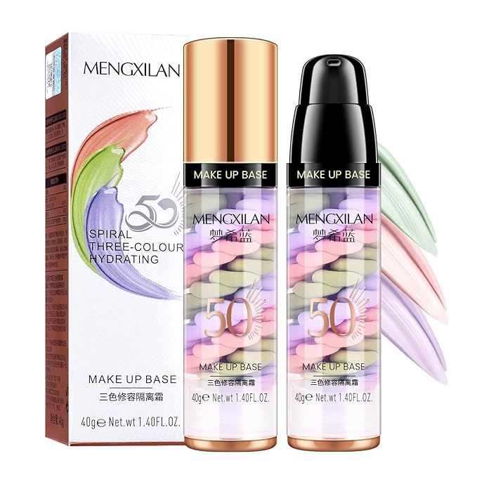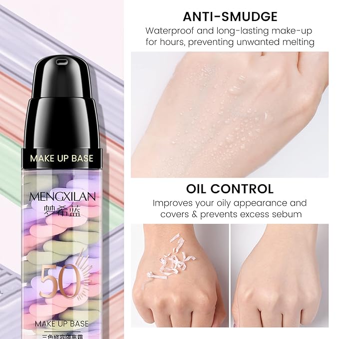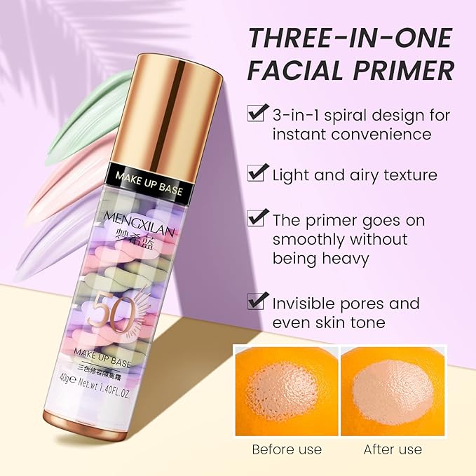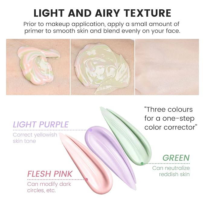 - 【Color Correcting Facial Primer】Contains 3 color-correcting pigments to even out the complexion. Light purple can correct yellowish skin tone, green can neutralize reddish skin, flesh pink can modify dark circles, etc.