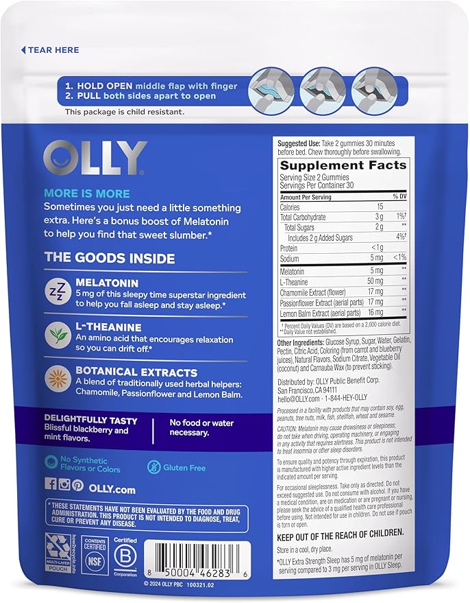 - OLLY EXTRA STRENGTH SLEEP GUMMIES: Melatonin gummies, with L-Theanine that works with your body to help you fall asleep and stay asleep