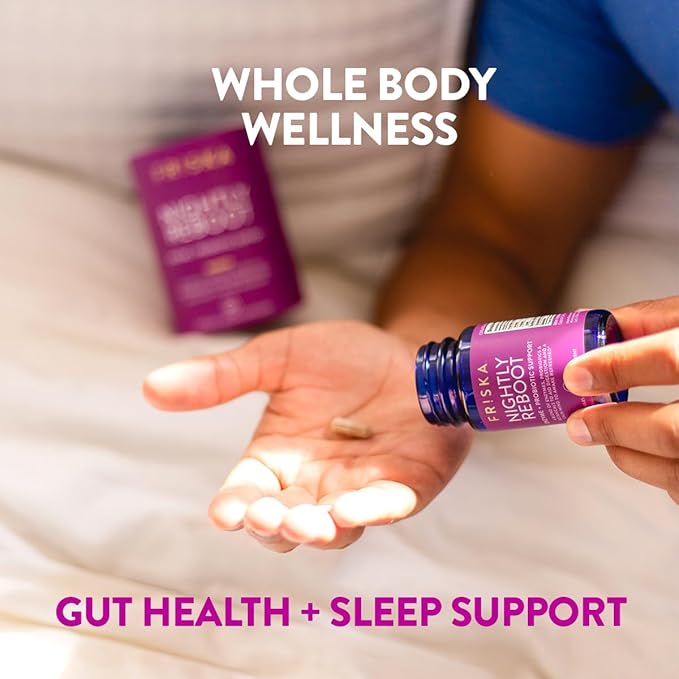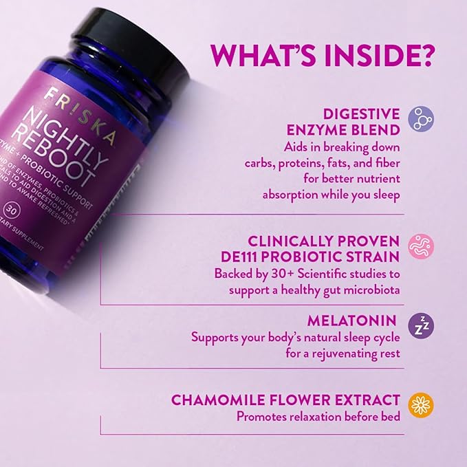 FRISKA Nightly Reboot Enzyme and Probiotics Supplement, Promotes Better Digestion and Sleep, Supports Gut Health for Men and Women, Melatonin, Chamomile, 30 Capsules