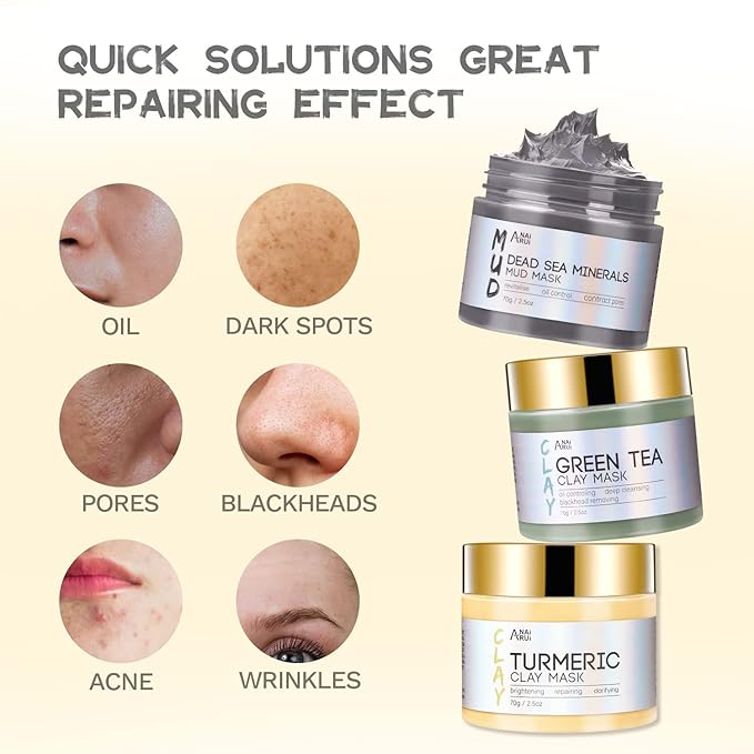 • FACE MASK GIFT SET--ANAI RUI clay mask set for face with natural and clean ingredients for all skin types ! Perfect for face mask gift set. With Turmeric VC Face Mask, Green Tea Mask, Dead Sea Mud Mask 3 in 1 clay mask kit .70g each bottle .Our face mask skincare gift set is not only a perfect skincare gift option but also an ideal self-care treat for anyone seeking a rejuvenating skincare experience