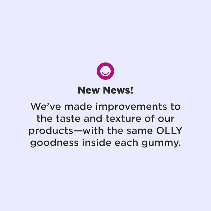 - NEW NEWS: We’ve made improvements to the taste and texture of our products—with the same OLLY goodness inside each gummy