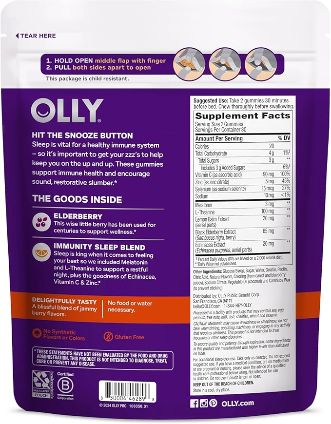 - OLLY IMMUNITY SLEEP + ELDERBERRY: Sleep is vital for a healthy immune system, so it’s important to get your ZZZ’s. This sleep combo encourages sound, restorative slumber and immune health