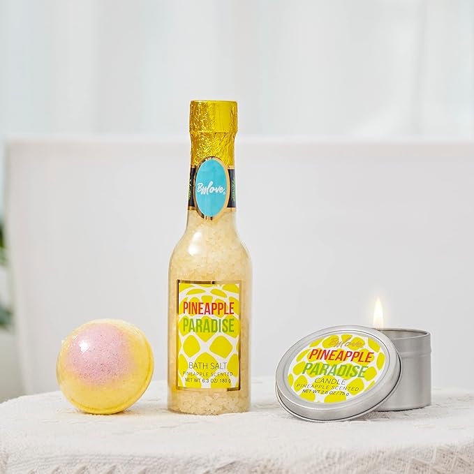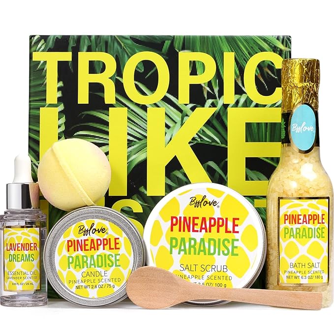 - Pineapple Spa Set for Women: Our luxury spa kit formulated with enriching shea butter and vitamin E, which helps moisturize and soften dry skin