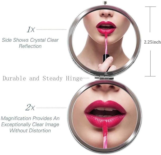 • MIRROR DETAILS: Diameter : 2.75", thick : 0.6". Double-sided mirrors: regular and 2X magnifying mirror, the above part is 1:1 lens, the under part is 2:1 magnifying. Its material are metal and crystal. The knot bracelet diameter is 2.37 inches.