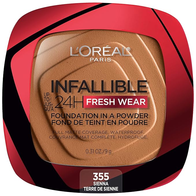 L'Oreal Paris Makeup Infallible Fresh Wear Foundation in a Powder, Up to 24H Wear, Waterproof, Sienna, 0.31 oz.