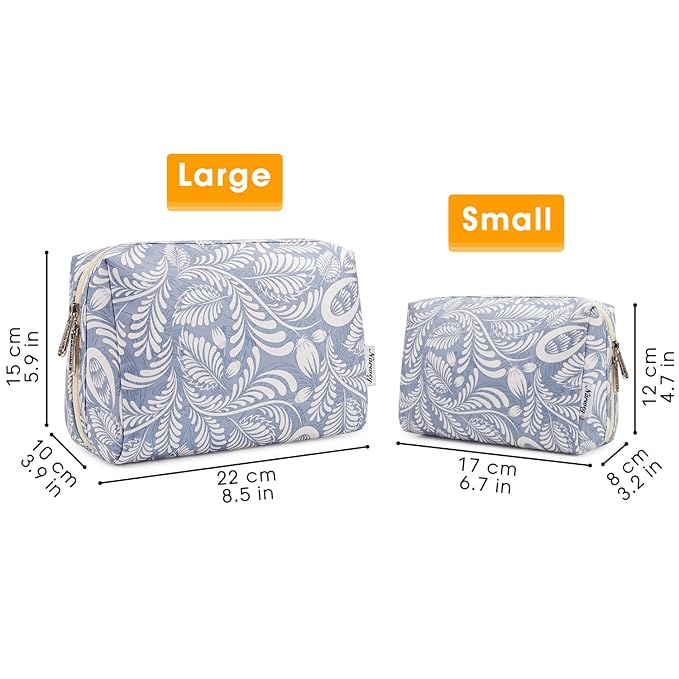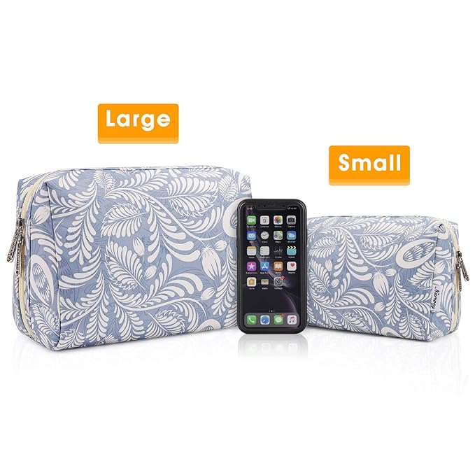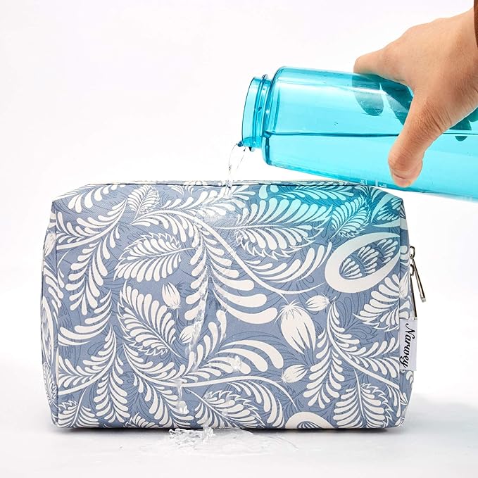 Narwey Cute Makeup Bag Travel Cosmetic Bag Organizer Toiletry Bag Make Up Bags with Compartments for Women Girls (Large, Blue Leaf)