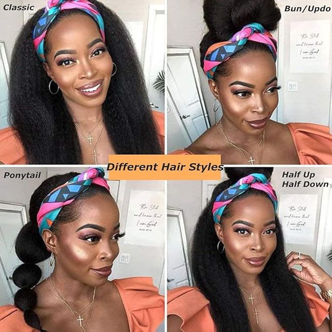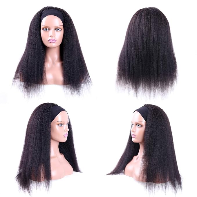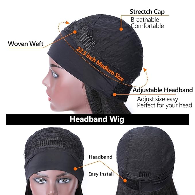- Human Hair Headband Wig Cap Size : It is kinky straight headband wigs for black women,this wigs with elastic ice silk headband attached, 22.5 Inches(Medium) In Circumference, Fits Most Women, 4 Combs And Velcro Help To Secure.