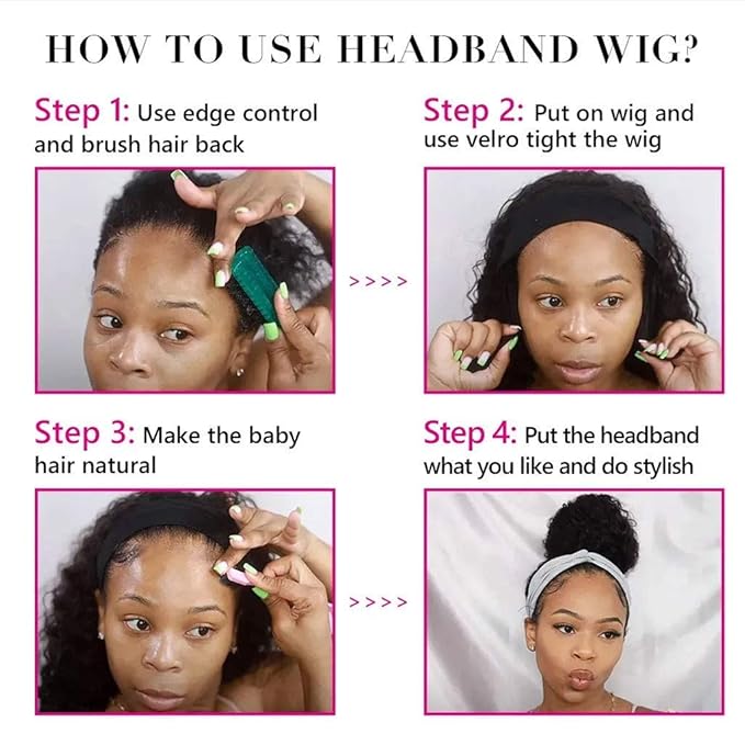 - Headband wigs for black women, fit all heads and it allow you to show your natural hairline ,can make different styles as your like , when wear the headband wig please do not cover your hairline because of the cap structure , and it will make you looks more natural.