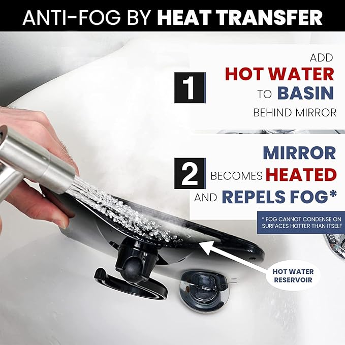 - DUAL ANTI-FOG DESIGN FOR A CLEAR SHAVE: This black shower mirror incorporates a unique dual anti-fog design, featuring an anti-fog coating along with a built-in back chamber that can be filled with hot water to effectively prevent fog buildup