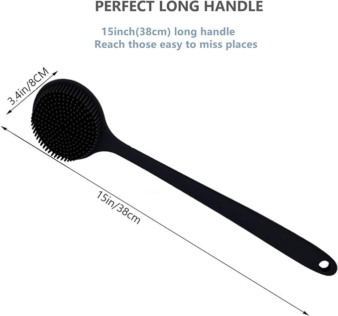 - 15inch Long Handle Body Scrub Brush: The size of the silicone shower back brush with long handle is designed to help reach each part of your body. At 14.8inch x 3.3inch this bath brush is perfect for reaching all areas of your body.