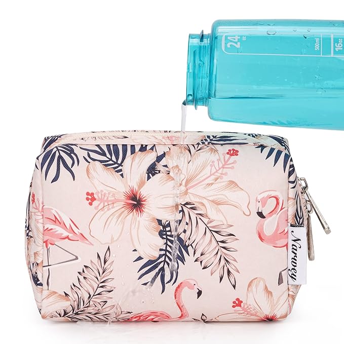 Narwey Small Makeup Bag for Purse Mini Cosmetic Bag Travel Makeup Pouch Zipper Pouch Cute Make up Bags with Compartments for Women Girls (Beige Flamingo, Small)