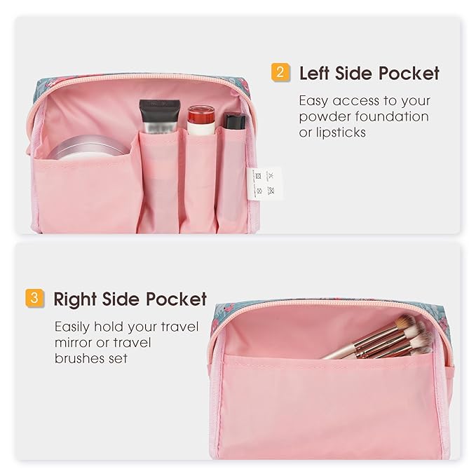 - Multiple Storage Compartments - Practical main compartment with 5 inner small pockets could neatly organize your makeup. Main compartment could hold many small items. Left side pockets could hold your concealer or lipsticks, while right side pocket are great for your travel mirror or travel brushes set. It could fit lipstick, blushes, powder, eyeliner, foundation, concealer, eyeshadow pallet, mascara, lash curler, sponage, small brushes